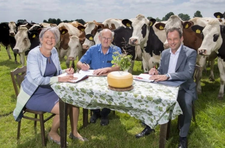 The official signing ceremony took place at the EKO-certified dairy farm 'Hoeve Ackerdijk' in Schipluiden, near The Hague in the Netherlands. Owner Arie van den Berg (center) is also a board member of the foundation; he signed the cooperation with EKO Quality mark project leader Nicoline Roozen (left) and Ben Dellaert.