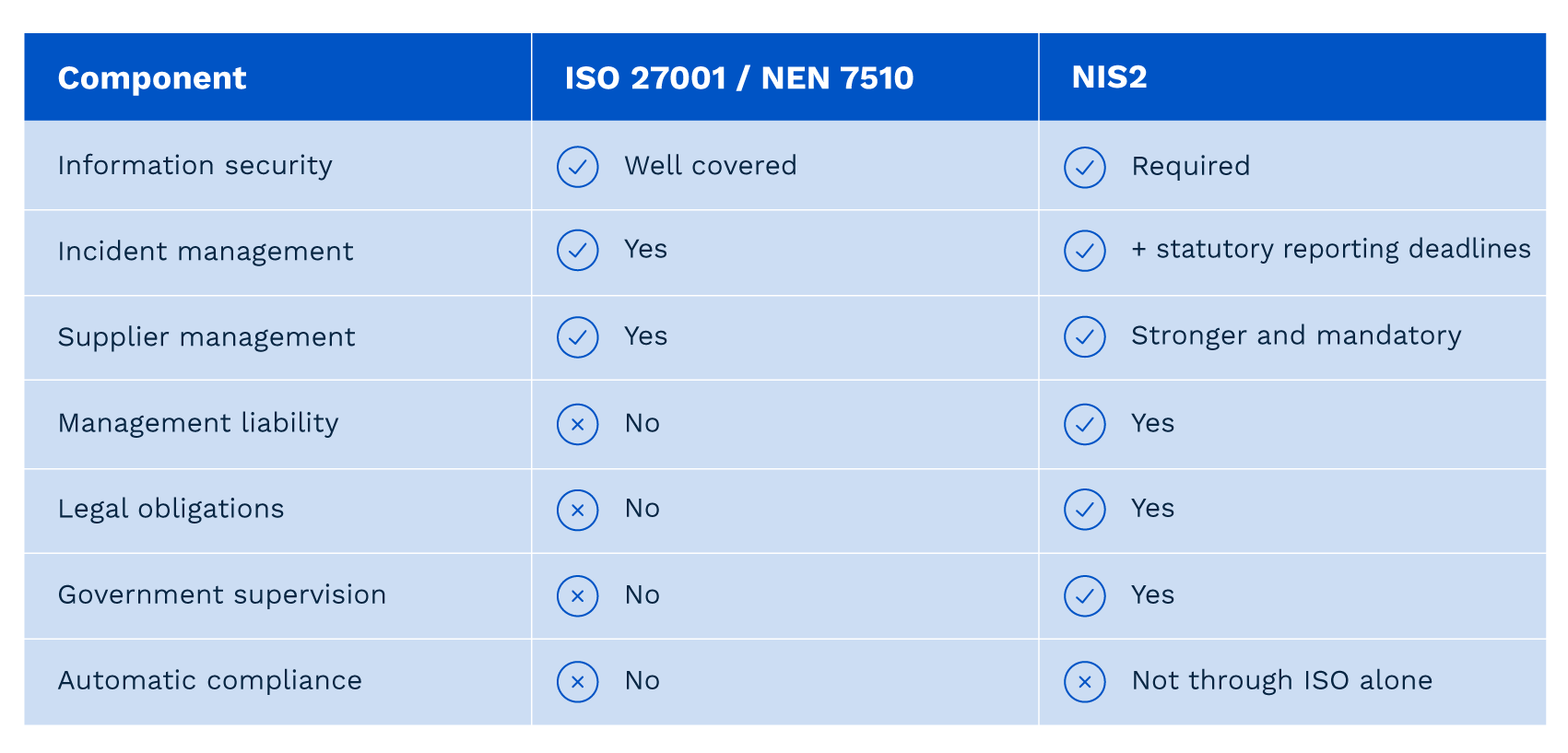 ISO 27001 and or NEN 7510 certification helps significantly, but organizations do not automatically comply with NIS2. The diagram below shows which aspects are covered by ISO 27001 or NEN 7510 and which by NIS2.