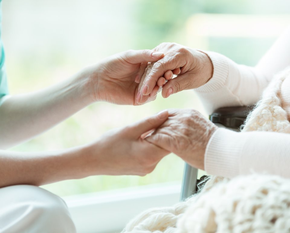 Handen die elkaar vasthouden met een achtergrond van sleutels en een medische alarmknop.